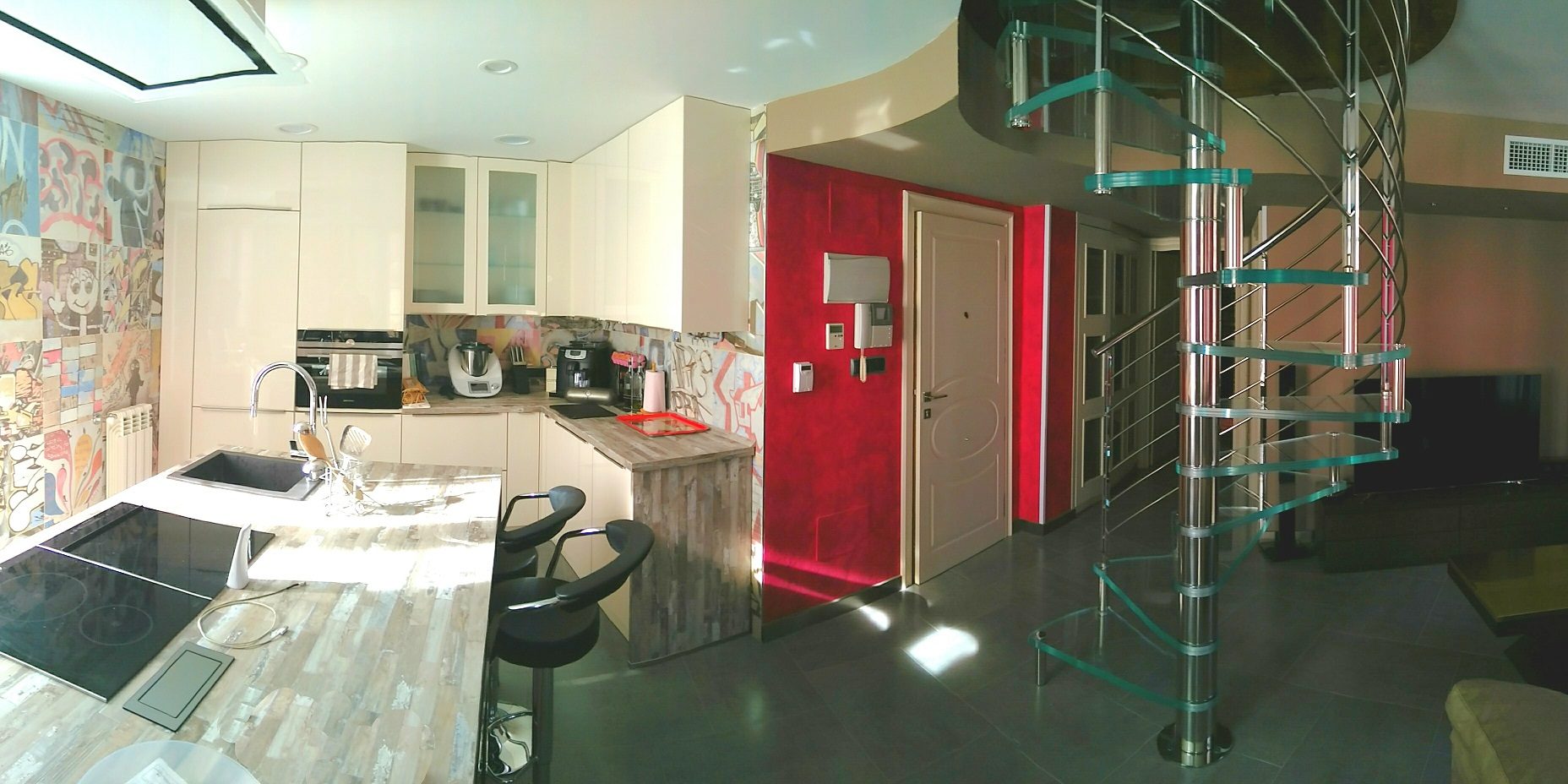 La ejecución está basada en la unión de dos pisos, uno de ellos con buhardilla, por mediación de una apertura en los forjados y la instalación de una escalera de caracol en acero inox y pisas de vidrio.